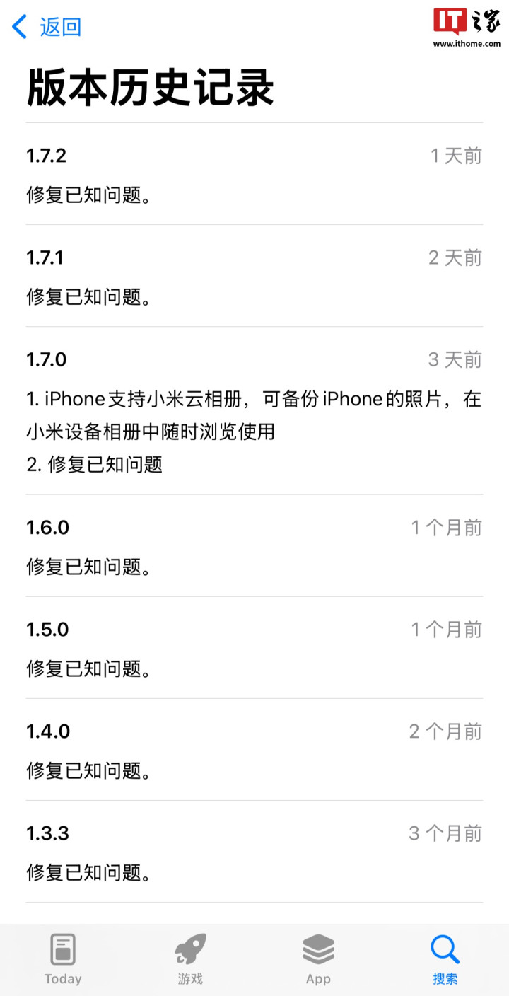IT之家注意到,小米互联服务App的版本历史记录显示,其在3天前更新1.7.0版本(当前版本1.7.2),新增iPhone支持小米云相册功能,该功能不仅可备份iPhone照片,还允许小米设备浏览使用。